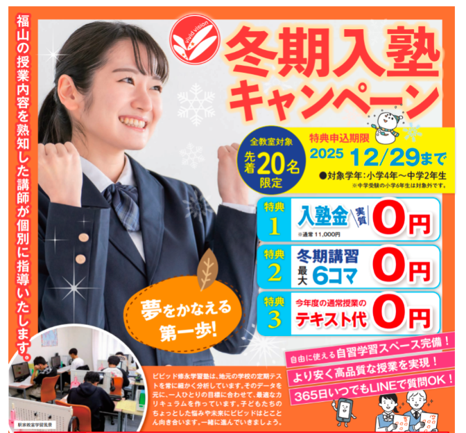 ビビッド修永学習塾は、福山市地域密着型の個別指導学習塾です。福山市の学校の授業に特化し準拠テキストやオリジナル教材で教科書のポイントをしぼった効率的な学習を行います。生徒一人ひとりの学習状況や各学校の授業の進度を把握して指導します。また、授業時間外も全面サポート!365日LINEでいつでも質問できます!