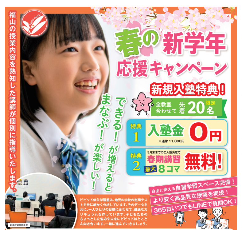 ビビッド修永学習塾は、福山市地域密着型の個別指導学習塾です。福山市の学校の授業に特化し準拠テキストやオリジナル教材で教科書のポイントをしぼった効率的な学習を行います。生徒一人ひとりの学習状況や各学校の授業の進度を把握して指導します。また、授業時間外も全面サポート!365日LINEでいつでも質問できます!