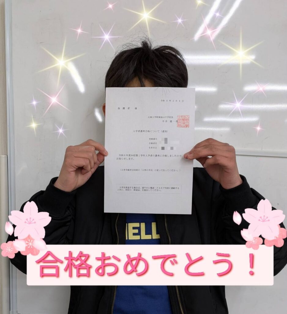 広大附属福山中 合格です! NEWS 2026.02.21 広大附属福山中に見事合格したSさん!本当におめでとうございます🎉 Sさんは国語が得意です。小5の春に入塾し、苦手意識のある算数を中心にたくさんの問題を何度も解きなおし自分のものにしていきました。理科や社会は受験では考える時間はあまりないので、すぐに答えられるようになるまで覚えていきました。途中でくじけそうになった事もありましたが、諦めず頑張った事が合格に繋がったと思います✨最後まで本当によく頑張りました😊